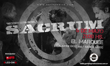 El jueves 6 de mayo a las 21.00 Sacrum tocará en Marquee (Scalabrini Ortiz 666, ciudad de Buenos Aires). Las entradas están en venta en los locales de Locuras y Lee-Chi.